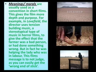 This document discusses various techniques used in short films to effectively tell stories within their limited timeframes. It describes how soundtracks, ambient sounds, sound effects, and music can set scenes and manipulate audience emotions. Quick shots are used to efficiently establish plots and settings. Narration can share experiences when dialogue is not needed. Common devices like clichés, cliffhangers, and leaving questions unanswered keep audiences engaged in the short format.
