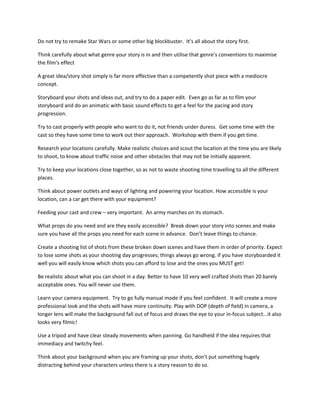 The document provides tips for creating title sequences and short films. For title sequences, it advises considering how titles are incorporated stylistically, their pacing, color, and relationship to music. For short films, it recommends focusing on a simple idea, rewriting, authentic settings/characters, storyboarding, proper casting/locations, and efficient shooting/editing to tell a compelling story within limited time and resources. Sound design, music, and lean editing are also emphasized as important elements of short films.