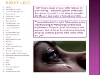The document outlines the creative process and thematic elements for a short film centered on grief, focusing on a girl reflecting on her mother's death and the obscure items in their home. It emphasizes the importance of body language and minimal dialogue to convey emotions, while exploring themes of loss, isolation, and the lingering presence of loved ones. Influences from other films are discussed, highlighting the use of metaphors and storytelling devices to illustrate the five stages of grief through a unique narrative style.