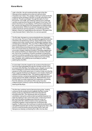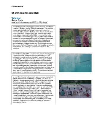 The film begins with a montage sequence showing various people in a forest, with a missing person sign attached to trees implying someone has gone missing. It then cuts to a title sequence featuring the missing girl in a swimming pool, using muffled sound and bubbles to create uncertainty. Later, a group of teenage boys are shown in a derelict swimming pool, negatively portrayed. It's revealed the missing girl is alive, but her relationship with one of the boys develops and she later dies, shown through finding her pink flip flops. The film switches between the boy having flashbacks of her and reality, using lighting and sound to portray happiness and sadness. It ends by zooming out from the boy alone in the road, but