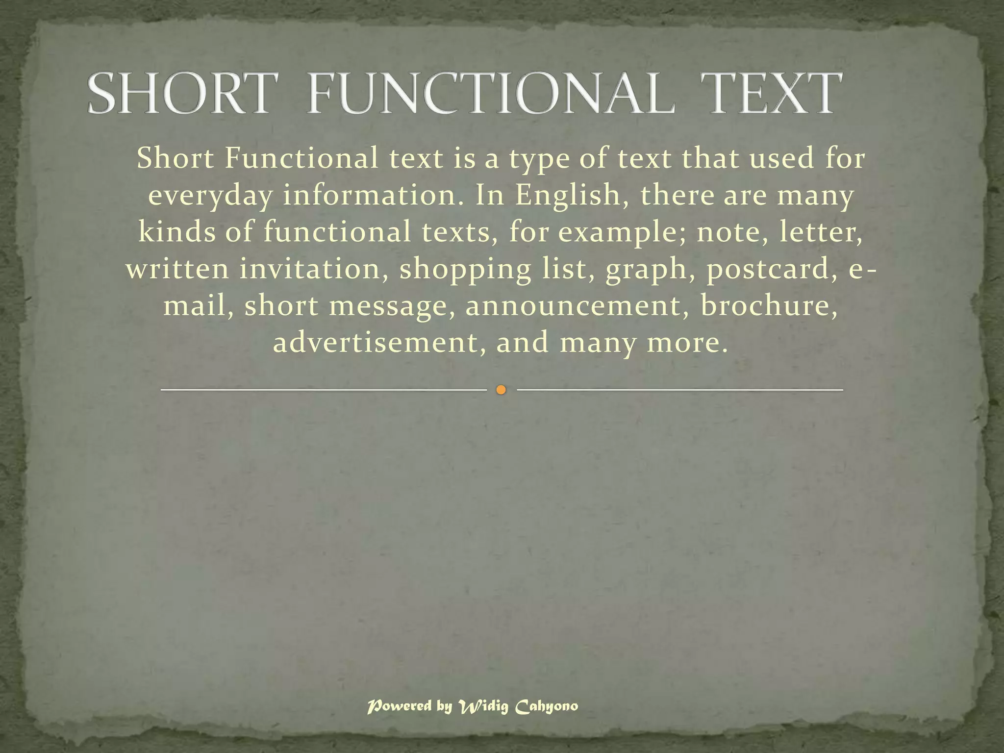 Short functional texts are used for everyday information and come in many forms like notes, letters, invitations, lists, graphs, postcards, emails, messages, announcements, brochures, and advertisements. They provide concise information about events, reminders, notices, and offers in a brief manner. Common elements include titles, dates, times, locations, and contact details.