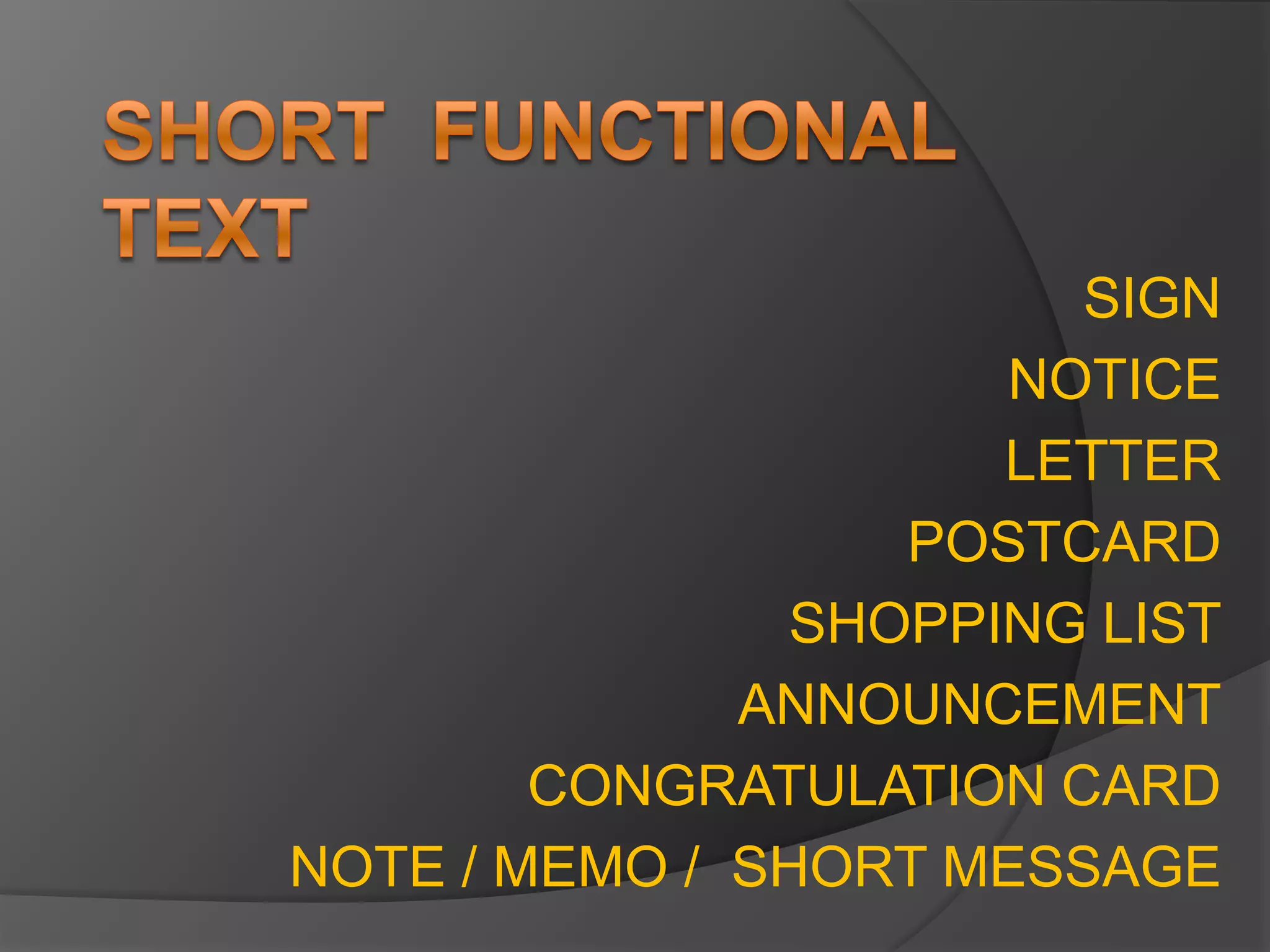 This document contains examples of short functional texts including signs, notices, identity cards, shopping lists, announcements, notes, postcards, letters, congratulation cards, get well cards, and instructions. The examples show the typical structure and content of these common short written forms of communication.