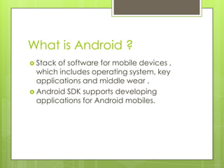 Android is a stack of software specifically designed for mobile devices, encompassing an operating system, key applications, and middleware. It includes an SDK that facilitates the development of applications for Android mobiles. The document also touches on the architecture of Android.