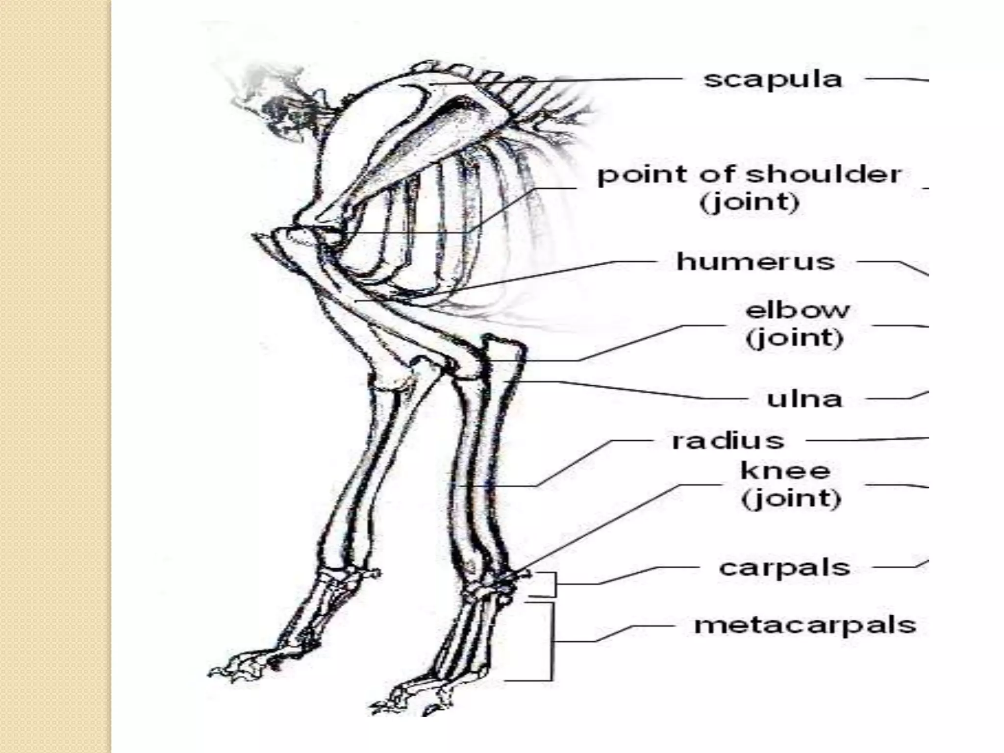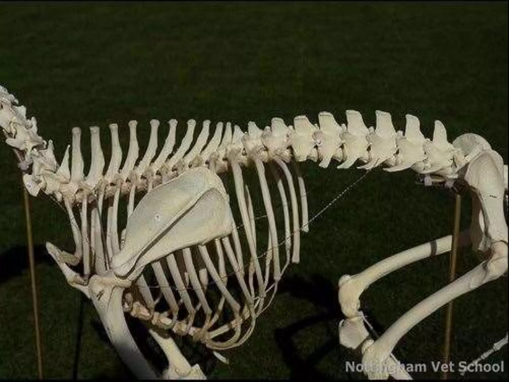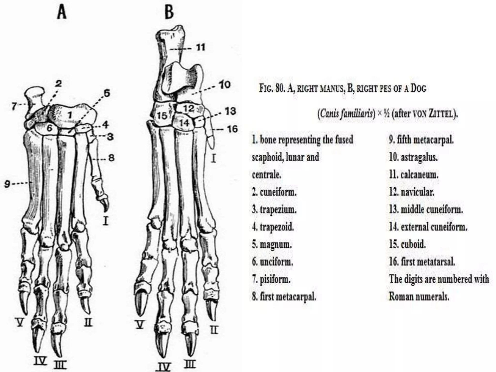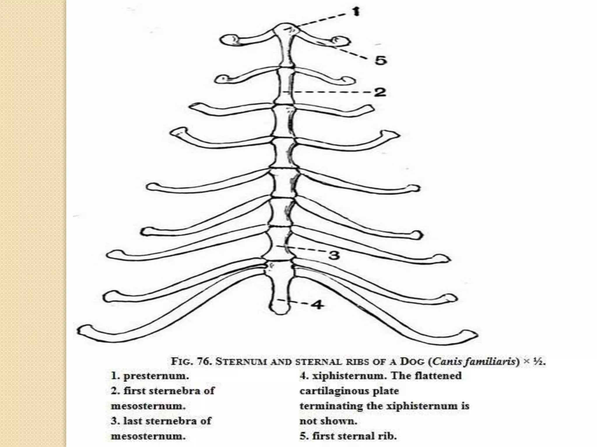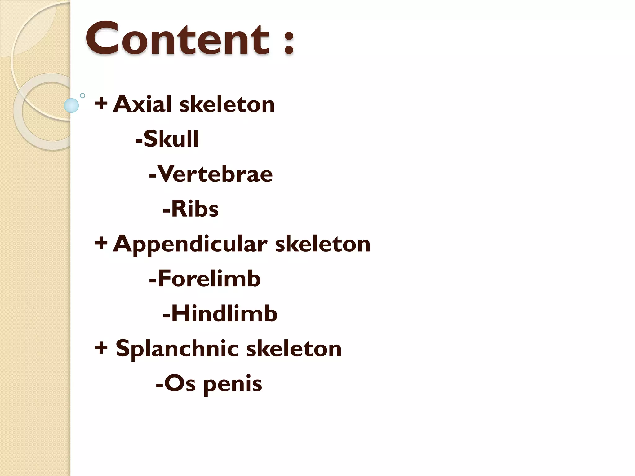 The document provides a detailed overview of the skeletal system in dogs, including the axial skeleton (skull, vertebrae, ribs), appendicular skeleton (forelimb and hindlimb), and splanchnic skeleton (os penis). It elaborates on the composition and structure of various bones, joints, and the organization of the thoracic and pelvic girdles, as well as specifics about the limbs. Additionally, it explains the articulation of bones, development of the sternum, and the function of the os penis in male dogs.