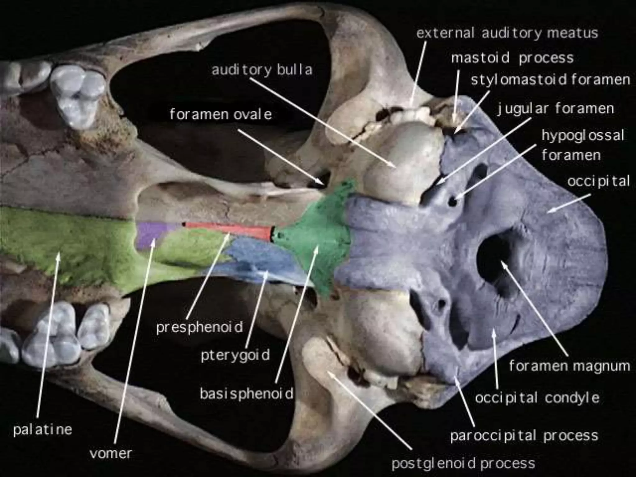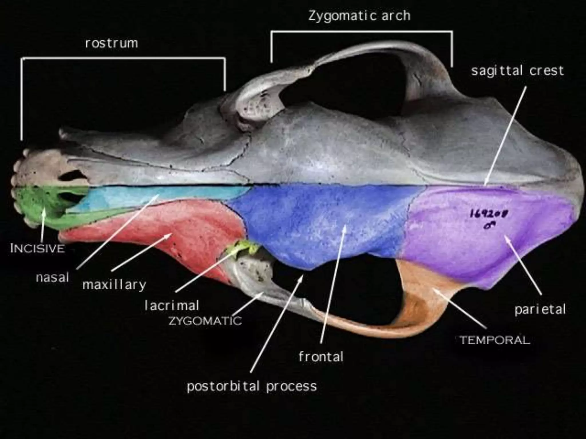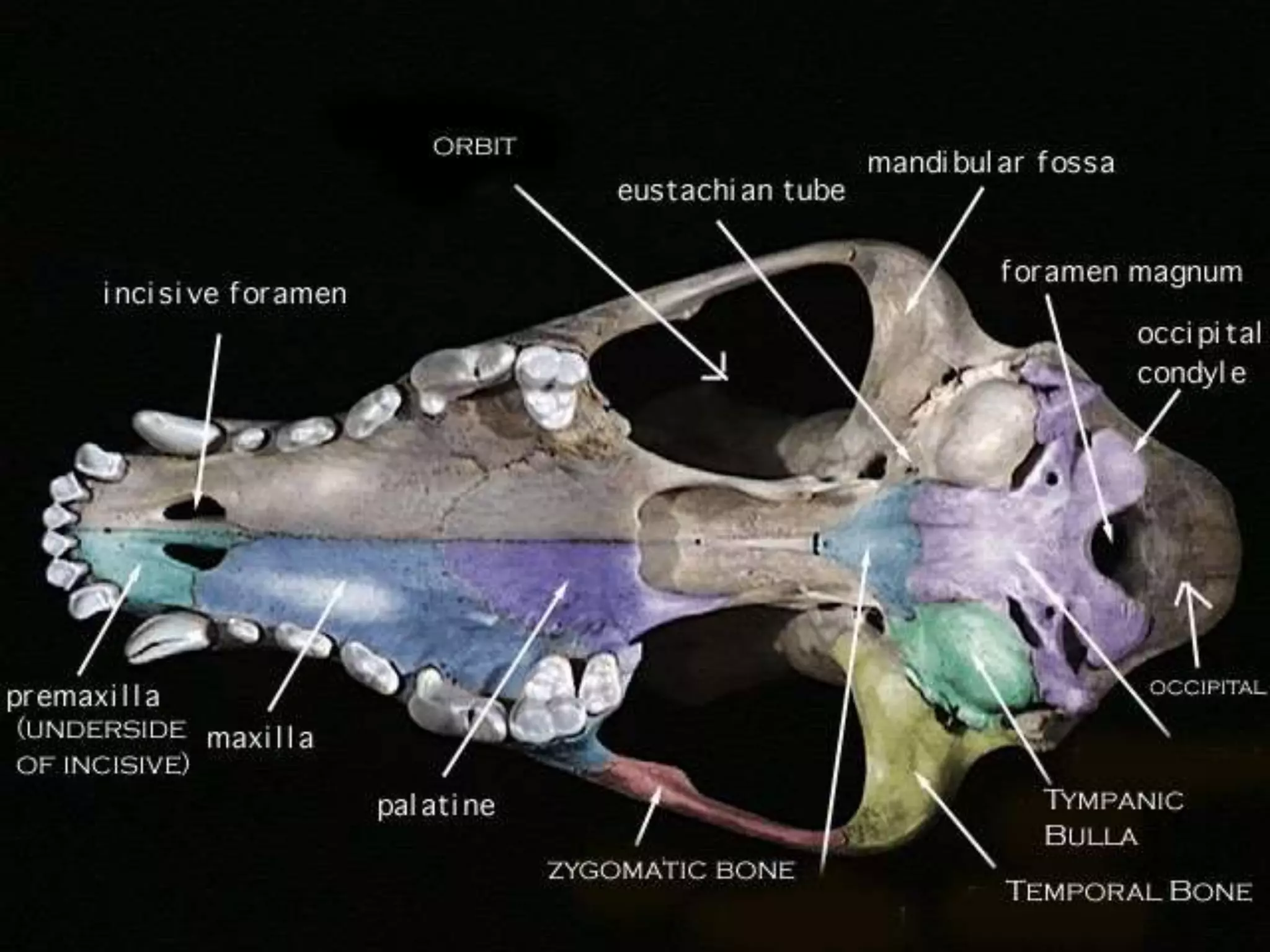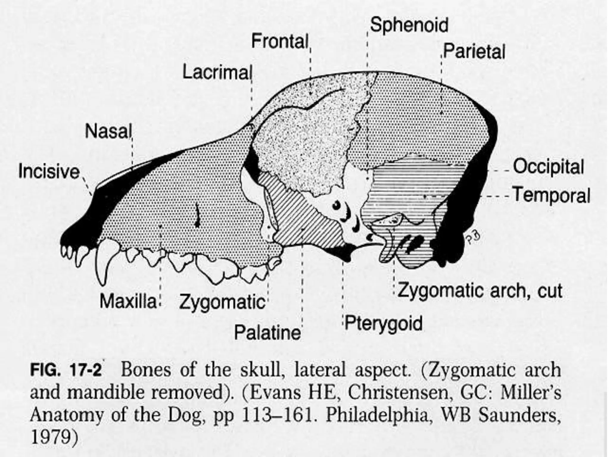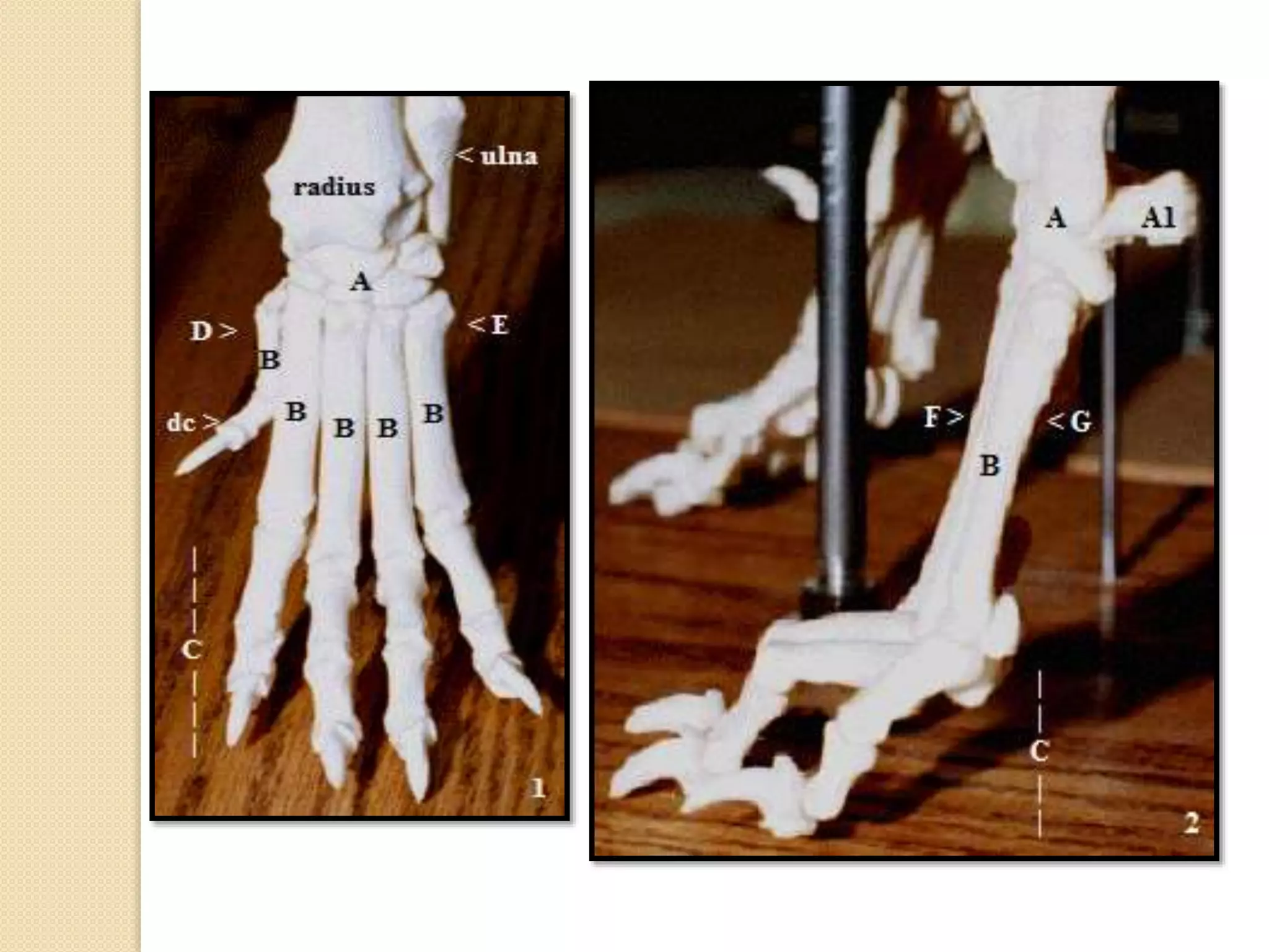 The document provides a detailed overview of the skeletal system in dogs, including the axial skeleton (skull, vertebrae, ribs), appendicular skeleton (forelimb and hindlimb), and splanchnic skeleton (os penis). It elaborates on the composition and structure of various bones, joints, and the organization of the thoracic and pelvic girdles, as well as specifics about the limbs. Additionally, it explains the articulation of bones, development of the sternum, and the function of the os penis in male dogs.