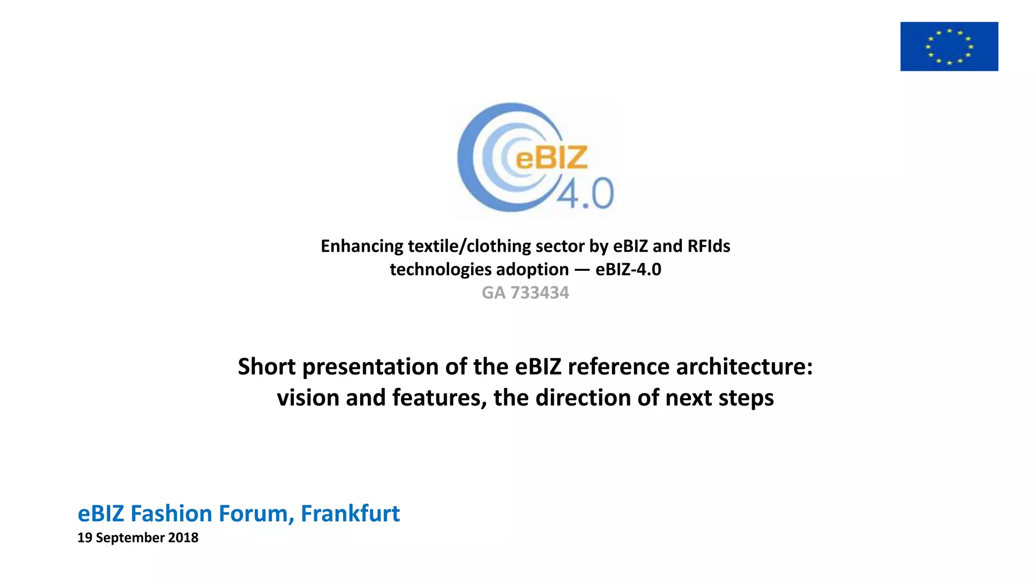 The document presents the ebiz fashion forum held in Frankfurt on September 19, 2018, focusing on enhancing the textile and clothing sector through the adoption of ebiz and RFID technologies. It outlines the vision for increased interoperability in supply chains, detailing the features of the ebiz reference architecture, which promotes unambiguous data exchange and supports incremental adoption across various organizations. The presentation also highlights the capabilities for digitalization, machine-to-machine communication, and traceability in the fashion supply chain.