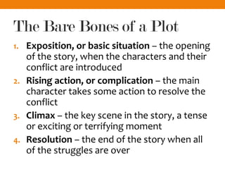 The document provides an overview of key elements in short stories, including exposition, rising action, climax, resolution, and how these elements relate to the structure of a plot. It also discusses sequencing of events like chronology and flashbacks, types of conflicts like internal and external struggles, and literary devices like sensory details, imagery, setting, and characterization. The summary defines some basic building blocks for understanding short stories at a high level.