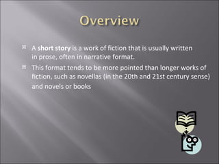 Short stories are a form of fiction, usually written in prose and narrative format, that focus on a single incident within a confined time and space. They emerged as their own genre in the 19th century alongside the growth of magazines that published short fiction. While short stories may follow some dramatic story elements like other fiction, their brevity means they do not always include exposition, rising action, or other patterns. There is no universally agreed upon definition for what qualifies as a short story in terms of word count, though most are considered no longer than 20,000 words and no shorter than 1,000.