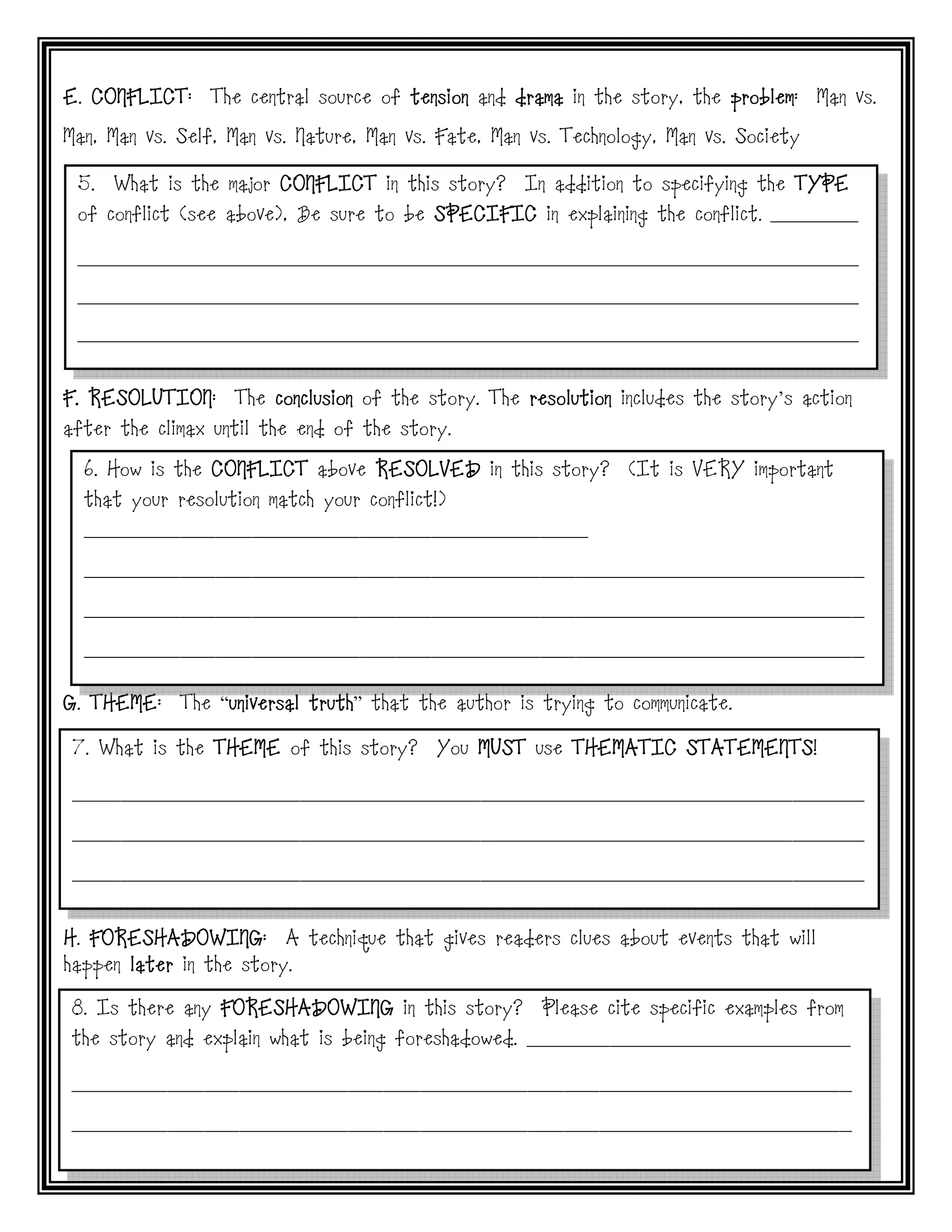The document is a short story analysis template that guides readers through various elements of narrative structure, including characterization, setting, point of view, conflict, resolution, theme, and literary devices. It prompts the user to fill in specific information regarding the protagonist, antagonist, and different techniques like foreshadowing and symbolism. Each section requires detailed answers to deepen understanding of the story's components.
