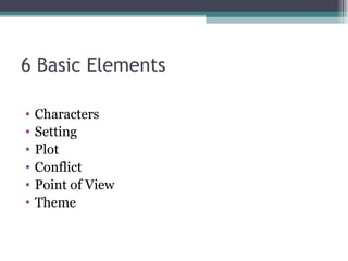 The document outlines the basic elements of short fiction stories, including characters, setting, plot, conflict, point of view, and theme. It defines these elements and provides examples. Characters can be major or minor, round or flat. The setting establishes the location and time period. The plot involves events building to a climax and resolution. Conflict can be external or internal. Point of view determines who tells the story. The theme conveys a central message or insight.