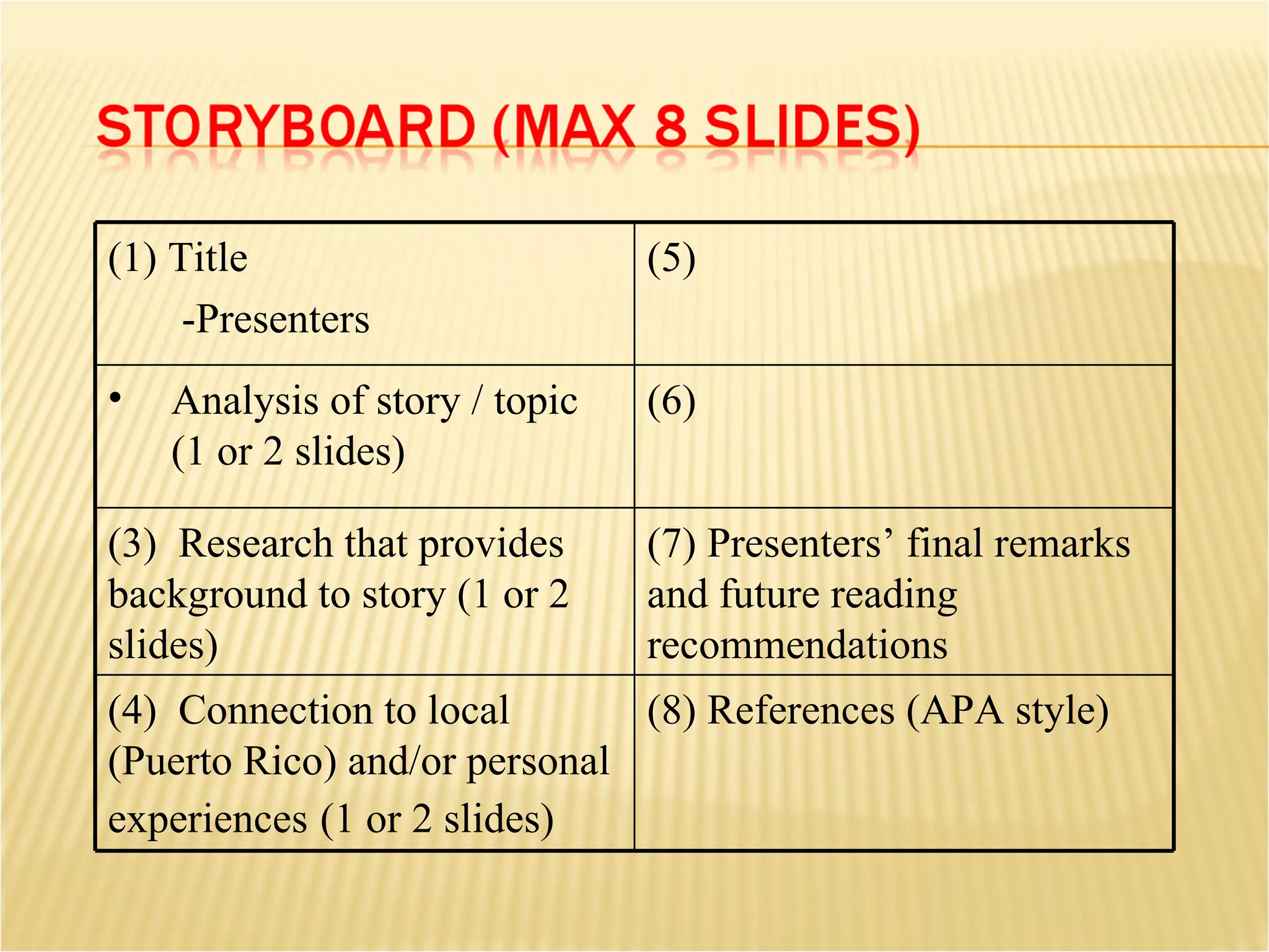 This document provides guidance for preparing a group presentation on a short story. It outlines an 8-slide storyboard format that includes: (1) title and presenters, (2) analysis of the story/topic, (3) background research, (4) connection to local experiences, (5) presentation of the analysis, (6) presenters' remarks and recommendations, (7) references, and (8) evaluation criteria. It also provides tips for designing effective slides, such as using the 6x6 rule for text amount and rehearsing the presentation.