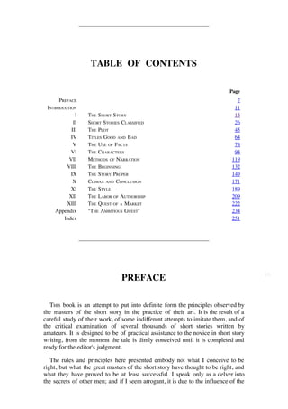 This document provides an overview of Charles Raymond Barrett's 1898 book "A Practical Treatise on the Art of the Short Story". The book aims to outline the principles and techniques used by masters of the short story based on Barrett's study of their works. It is intended to provide practical guidance to novice short story writers. Barrett analyzes various elements of short story writing including plot, characters, narration, beginnings, endings, and the labor of authorship. The book also contains examples from both successful and unsuccessful short stories.