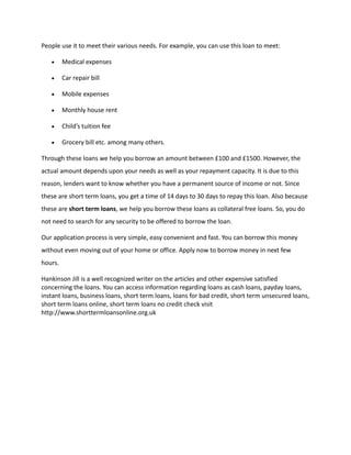 Short term loans can help meet urgent financial needs until your next payday. They allow you to borrow between £100-£1500 for 14-30 days to pay bills, medical expenses, home repairs, tuition and other costs. The application process is simple, fast and does not require collateral. Borrowers need a reliable income source, as the loans must be repaid quickly. These short term loans online help tide people over until their next paycheck when unexpected expenses arise before their usual salary.