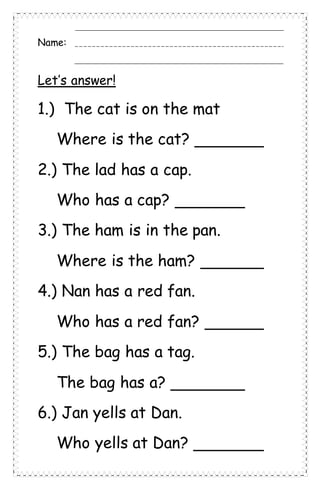 The document contains several passages that present simple questions to answer about the location or possessor of various objects. Each passage includes 6 statements with a question below it to test reading comprehension. The statements follow a pattern of including a subject, a verb or preposition, and an object to form simple sentences about objects and their locations or who possesses them.