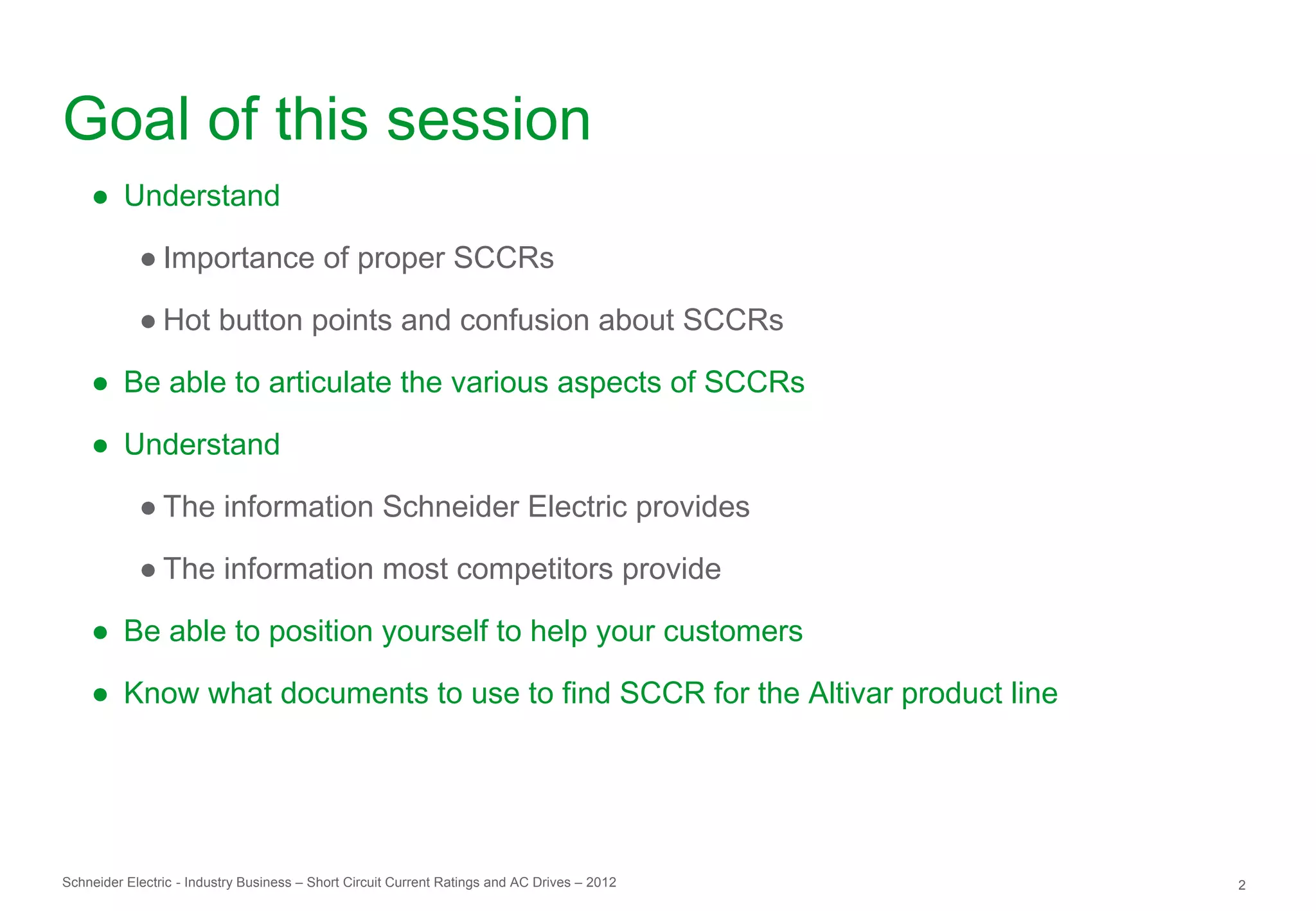 The document discusses the importance of short circuit current ratings (SCCRs) for AC drives, emphasizing their role in enhancing safety, reducing equipment damage, and minimizing production downtime. It highlights the differences in how various manufacturers, including Schneider Electric, approach SCCR testing and ratings, with Schneider taking a leadership stance on internal breakdown testing for accuracy. Additionally, it urges users to understand SCCR documentation to assist customers effectively and comply with industry standards.