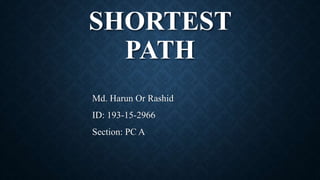 This presentation discusses algorithms for finding the shortest path between vertices in a graph. It introduces Dijkstra's algorithm, a greedy approach that can find the shortest path from a single source node to all other nodes in a weighted, connected graph. The algorithm works for both directed and undirected graphs, and examples are provided to demonstrate how it can be applied to find the lowest cost path between nodes.
