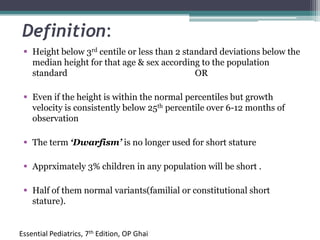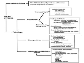 Short stature is defined as height below the 3rd percentile or more than 2 standard deviations below the median height for age and sex. Approximately 3% of children are short, with half having normal variants like familial or constitutional short stature. Investigations include blood tests, bone age, growth hormone stimulation tests, and karyotyping. Management depends on the underlying cause and may include dietary changes, medication like levothyroxine or growth hormone, or surgical procedures. Common causes of proportionate short stature include familial short stature, constitutional delay of growth, and certain genetic or medical conditions.