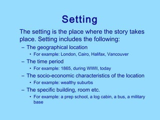 The document provides an overview of key elements of short stories, including setting, characters, plot, point of view, theme, irony, symbolism, flashback, and foreshadowing. It defines these elements and provides examples from short stories to illustrate how authors use each element in crafting their works.
