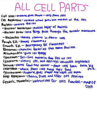 The document makes comparisons between structures and processes in cells to familiar objects and roles. It compares the nucleus to a king ruling a kingdom, ribosomes to cooks making energy-providing food, the smooth endoplasmic reticulum to highways helping transport, the vacuole to a cabinet storing food and water, lysosomes to soap keeping things clean, cytoplasm to water filling a space, the cell wall to walls protecting and shaping a plant cell, the cell membrane to police restricting entry, and the Golgi apparatus and chloroplast to entities that check/deliver essential items or make food, respectively.