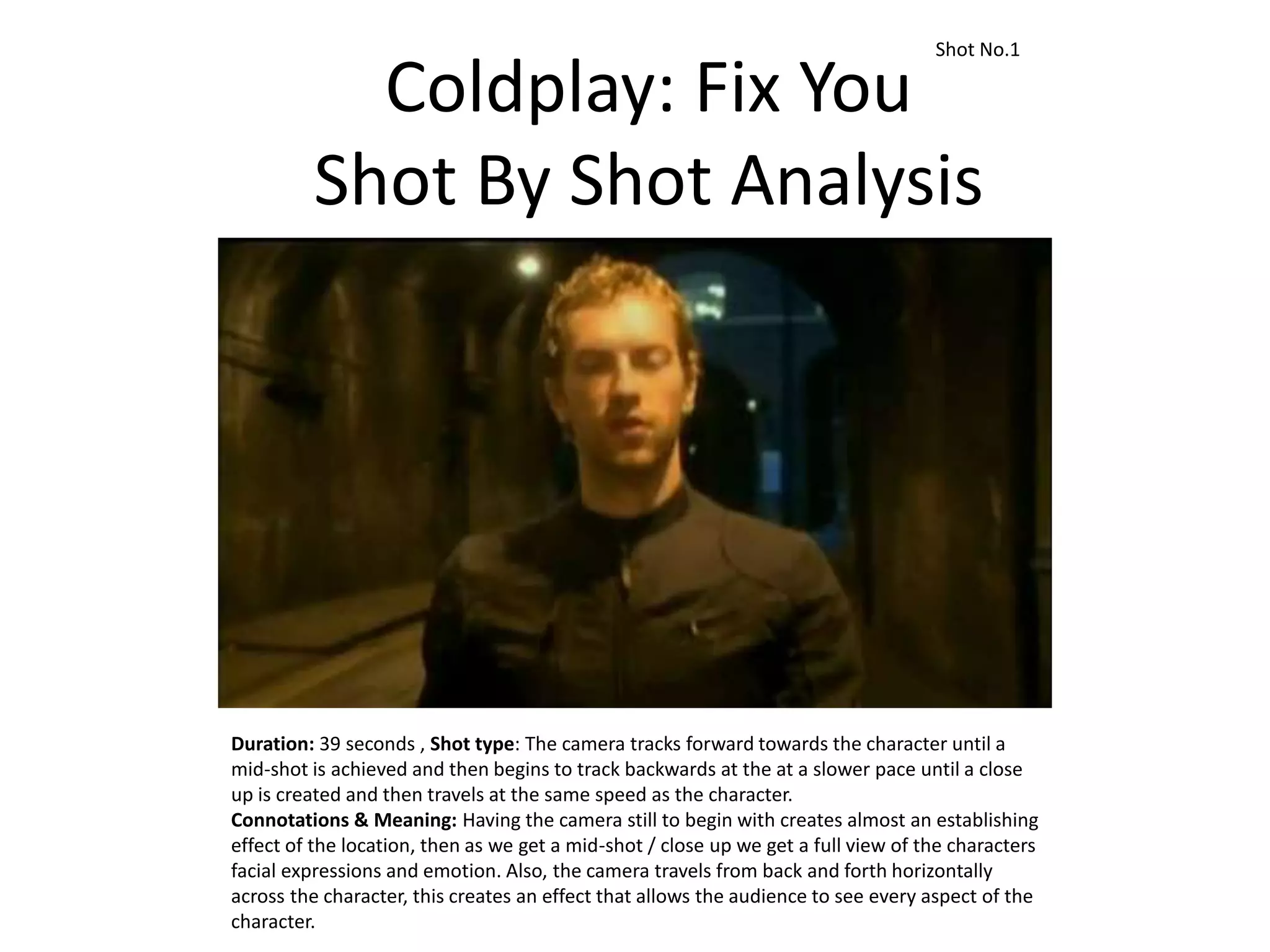 The document provides a detailed shot-by-shot analysis of the music video for the song "Fix You" by Coldplay. It examines 51 shots over the course of the nearly 4-minute video. The analysis describes each shot's duration, camera movements, and interpretations of the connotations and symbolism within the shots. Key elements analyzed include the use of lighting to represent the lyrics and the character's journey from confusion to finding guidance towards performing on stage in front of an enormous audience.