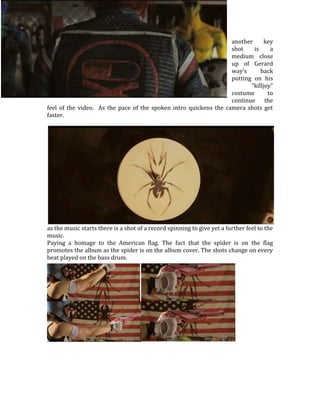 The music video analyzed contains 56 shots in the first minute, nearly one shot per second. The first shot is a long shot of someone skating down the road towards where a radio show is being aired. The second shot is an extreme close-up of the radio host speaking into a microphone. Another key shot is a medium close-up of the lead singer getting dressed in costume. As the spoken intro quickens, the camera shots get faster. When the music starts, there is a shot of a record spinning. Later shots show band members and the lead singer being screamed at by a villain, setting up a fight.