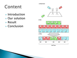 The document discusses shot boundary detection in videos using color histograms and feature points. It presents two common methods: using temporal color variation with histograms and using feature point matching between frames. It then provides results from testing the histogram method on a 250GB video database containing over 60 million frames, taking around 4 days to process with a 61% correct detection rate and 39% incorrect detections. The conclusion discusses room for improvement in dissolve shot detection and reducing false detections.