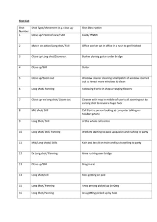 The shot list describes 17 shots documenting the preparations and travel of various people to a party up a hill, including close-ups of a clock, busker playing guitar, window cleaner, florist arranging flowers, and call center worker. It then describes shots of friends meeting up, walking and running up the hill together to the party, and having a water fight in the river, before the final shot shows the group of six friends walking off into the distance with their arms linked.