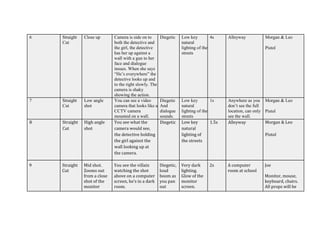 The document provides details on 35 shots for a film scene involving a detective investigating a girl. It describes elements like camera angles, character movements, lighting, sounds, and locations for each shot. The shots progress from the detective following the girl to confronting a villain at a computer while pointing a gun at him. The final shots involve the detective smiling and saying "Game over" as he pulls the trigger on the villain.