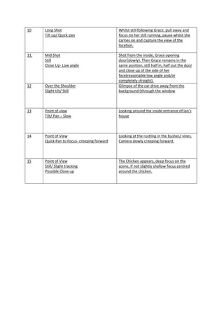 The shot list describes 15 shots to be filmed while following the character Grace. Shot 1 establishes the landscape outside the moving car window. Shot 2 shows Grace looking out the window of the car. Shot 3 shows her face from the front seat. Shot 4 tilts up to her face looking out the window. Shot 5 shows the point of view from the front of the moving car. The remaining shots follow Grace outside the car, with shots of her running and opening the car door. Interior shots show her looking around a house entrance and investigating rustling bushes, revealing a chicken.