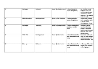 This document contains a shot list for a music video. It includes 34 shots with descriptions of the camera movement, location, lyrics covered, and any actors or elements included in each shot. The shots progress through different locations like a bar, house, countryside, campfire, and conclude back at the bar. They alternate between close-ups of the main actor and wider shots showing other characters or the full scene. The shots are designed to visually depict the lyrics and story of the song being filmed.