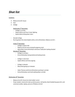 This document provides a shot list for filming at various locations including Rebecca Carroll's house, the park, and college. It outlines scenes to film on specific dates, including a fight between Sophie White and Fiona Tucker, Rebecca learning she is pregnant, Emma being bullied, and an argument between Sophie and Fiona. Props are also listed for scenes at Rebecca's house and the park involving a stalker.
