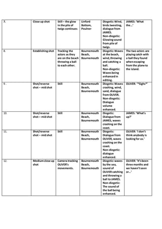 The document describes 29 shots from a film scene. It provides details for each shot such as camera movement, location, sounds, and a brief description of the shot content. The shots show two characters, Oliver and James, walking in a forest finding wood for a campfire. Oliver later discovers he has a mysterious ability to create fire with his fingers. They experiment with this new ability by lighting the campfire on the beach where they have been stranded for three months after surviving a plane crash.