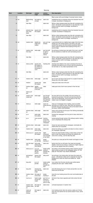 This document contains a shot list for a film project. It describes 32 shots ranging from establishing exterior shots of the character's home, to interior shots showing her bedroom and tent. Many shots involve panning and zooming to reveal more details. Key shots include showing the character reading an obituary, circling a name, drawing a picture related to the obituary, and reacting in surprise to a creaking sound. The mother then enters the room and has a confused reaction to seeing the tent.