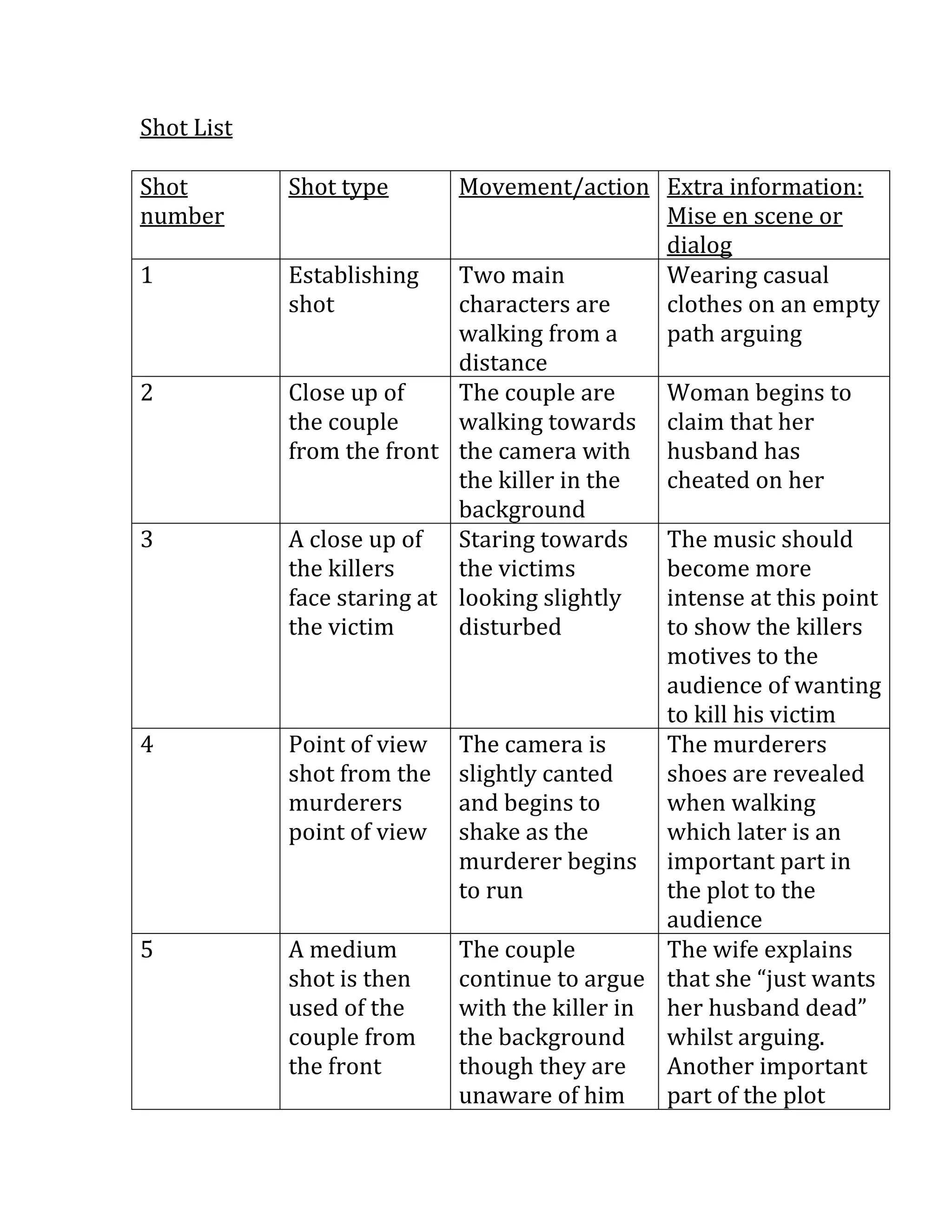 1. The document outlines 22 shots for a film scene involving a couple being attacked by a murderer while walking in a remote area.