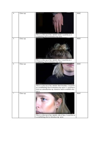This document is a shot list for a music video production titled "Mess is Mine". It contains 18 shots ranging from close-ups of the model to establish them, various camera movements like pans, tracks and reversals to follow the model. Shots focus on specific body parts, capture full figures and include shots of locations like a tunnel and bridge to correspond with lyrics and give a sense of journey. Timings are provided for each shot ranging from 2 to 30 seconds.