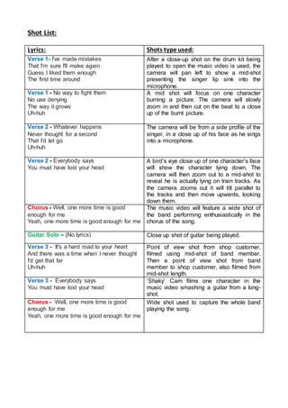 The document provides a shot list for a music video, describing the camera shots that will be used for each lyric or musical element. It includes various shots like close-ups of the drummer, singer, and guitarist, as well as mid-shots of characters burning a picture and lying on train tracks. Wide shots are listed to show the full band performing during the choruses. Point-of-view shots from customers and band members in a shop are also specified. The shot list coordinates the camera shots and angles with the lyrics, music, and storyline depicted in the video.