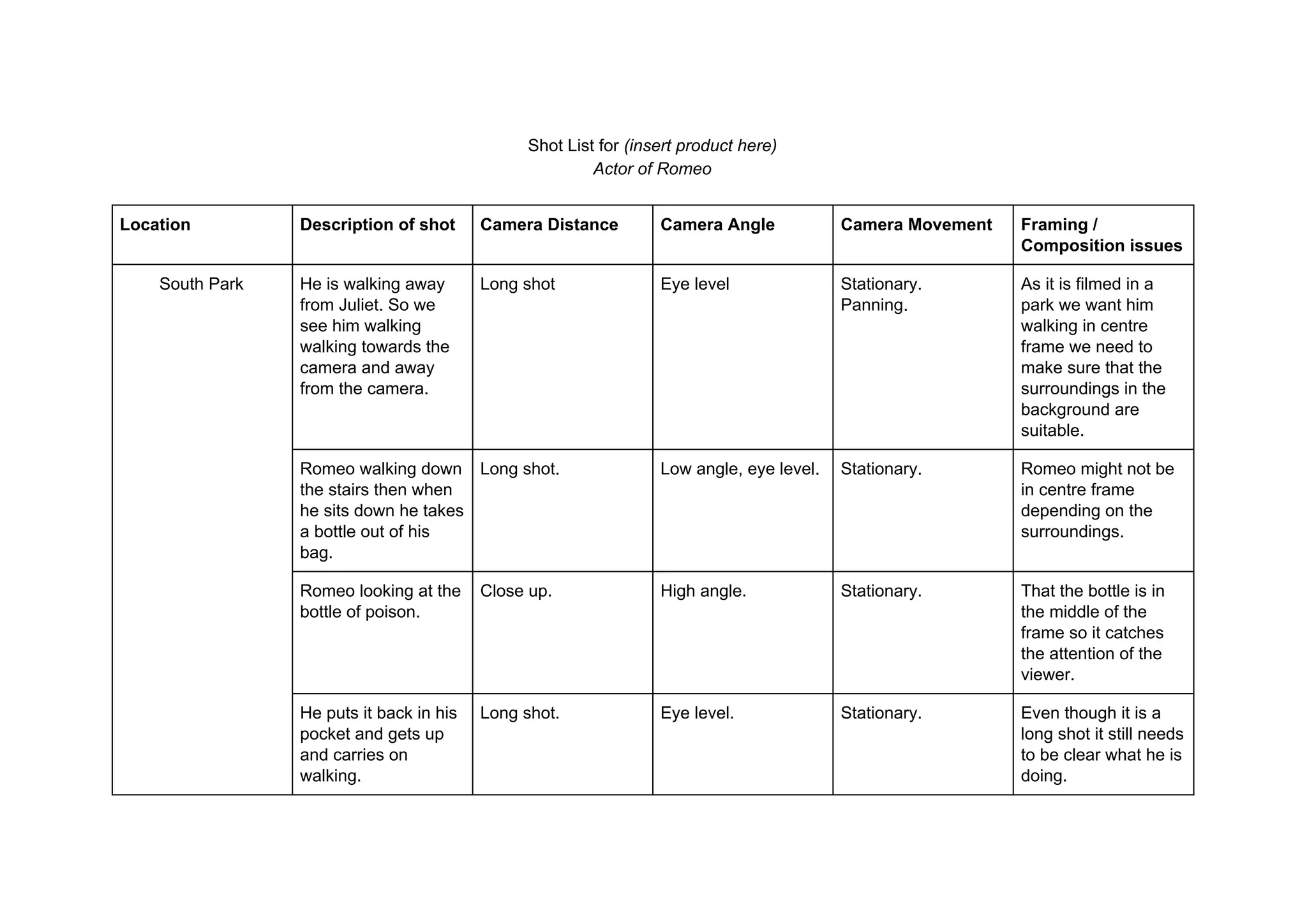 This document provides a shot list for filming scenes from Romeo and Juliet. It describes 7 different shots that are needed including the location, camera distance, angle, movement, and any framing or composition issues to consider for each shot. The shots include Romeo walking in the park from long and low angles, Romeo looking at a bottle of poison in close up, Romeo proposing to Juliet from long shot, Romeo and Juliet on a balcony from long wide shot, Romeo outside Juliet's house from medium shot, and Romeo declaring his love for Juliet from medium shot that zooms in. For each shot, the list specifies how the subject should be framed within the background surroundings.