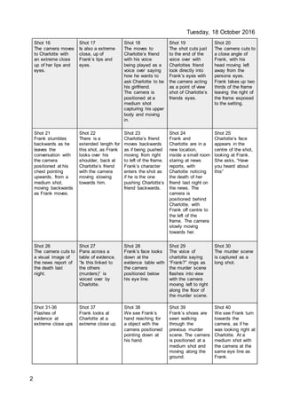 This document contains a shot list for filming on 19th October. It describes 42 shots, mostly focusing on characters Frank and Charlotte at a party and later investigating a murder. The shots include close-ups of the characters' faces, reactions shots, over-the-shoulder shots, shots of them interacting at the party and investigating evidence at the murder scene. The shots will be used to tell the story of their interactions and investigation of the murders.