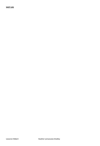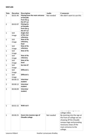 This shot log documents footage taken at Cheadle College, including still images and video clips of the college entrance, refectory, quad, and ICT suite. Video clips include footage walking around campus and an interview with a creative media student. The log notes the duration and purpose of each take, as well as comments on clips that were and were not used in the final video.