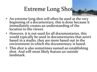 The document describes different types of camera shots commonly used in documentaries. An extreme long shot is used at the beginning to establish the location and show landmarks. A long shot shows the full body of a character with space above and below to include background. A medium shot contains the subject from the waist up for dialogue or action scenes with a blurred background. A close up focuses on a character's face or specific scene details, blurring the background. An extreme close up frames only a small facial feature like the eyes or mouth with no background visible.