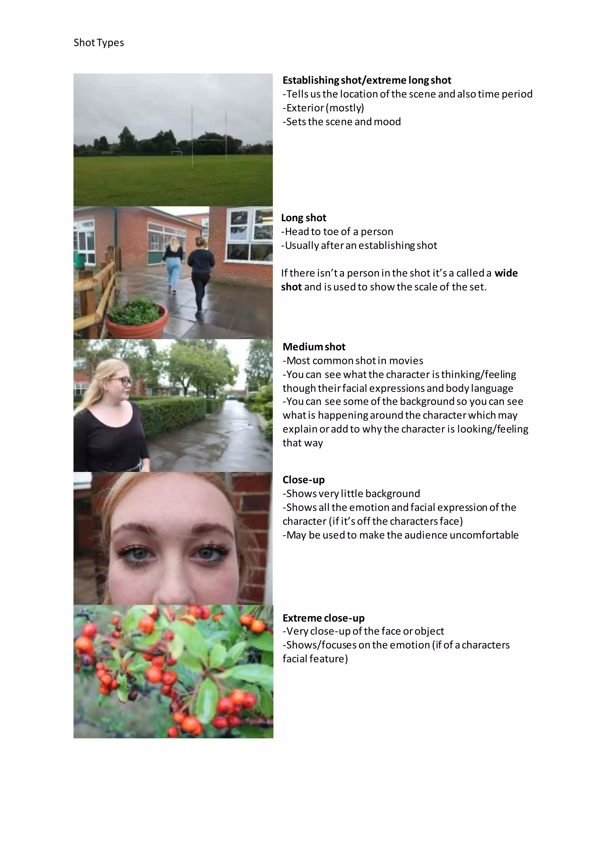 This document provides definitions and purposes for different types of camera shots used in filmmaking. It describes establishing shots as wide exterior shots that set the scene and mood. Medium shots show some background details and allow viewers to see a character's facial expressions. Close-ups focus intensely on a character's emotions. Point-of-view and over-the-shoulder shots allow audiences to see from a character's perspective or be included in their interactions. Two shots reveal relationships between two people in a scene.