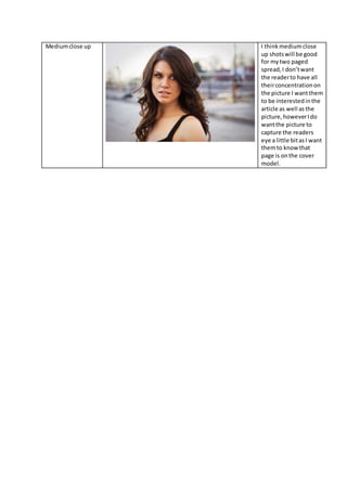 The document discusses different shot types for a magazine spread, including long shots for the contents page to show the cover model throughout, close up shots for the front cover to catch readers' eyes, and medium close up shots for a two-page spread to balance attention between the photo and article.