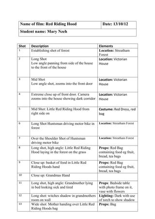 The document is a shot list for the film "Red Riding Hood" containing 25 shots with descriptions of the location, elements, props, costumes, makeup, and lighting for each shot. Key locations include a Victorian house, Streatham Forest, and St Leonards Baptist Church. Recurring props include a red bag containing food, a bedside table, bible, and candle. Costumes highlighted are Little Red Riding Hood's red dress and scarf and the Witch's black cloak. Elements like the Witch's shadow and eyes are also noted.