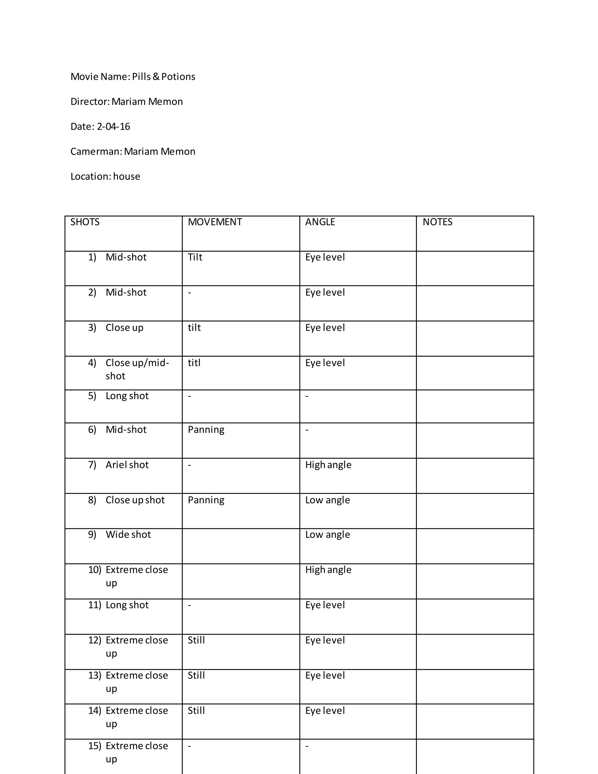 This document is a shot list for the movie "Pills & Potions" directed by Mariam Memon and filmed on 2-04-16. It details 15 shots with information on shot type, movement, angle and notes. The shots include mid-shots, close-ups, long shots, aerial shots and extreme close-ups, with tilting, panning and stationary cameras from various angles like eye level, low angle and high angle.