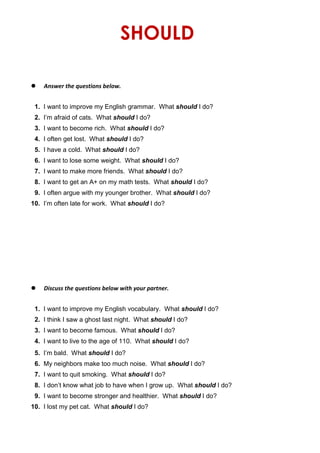 The document provides guidance on using the modal verb "should" through a series of examples asking what a person "should" do in different situations. It includes questions about improving skills, dealing with problems, making decisions, and establishing appropriate behaviors. Respondents are asked to use "should" to answer the questions, discuss further examples with a partner, complete sentences testing their understanding, and fill in blanks with the correct form of "should". The purpose is to help learners understand when and how to use the modal verb "should" in giving advice and recommendations.