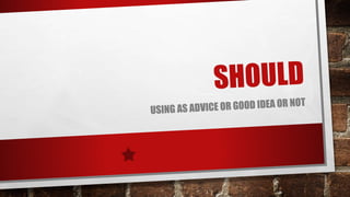 The document explains the use of 'should' and 'shouldn't' as advice in English. It provides examples of their usage in sentence structures and conditional sentences to indicate good or bad ideas. Additionally, it includes exercises for practice with these structures.