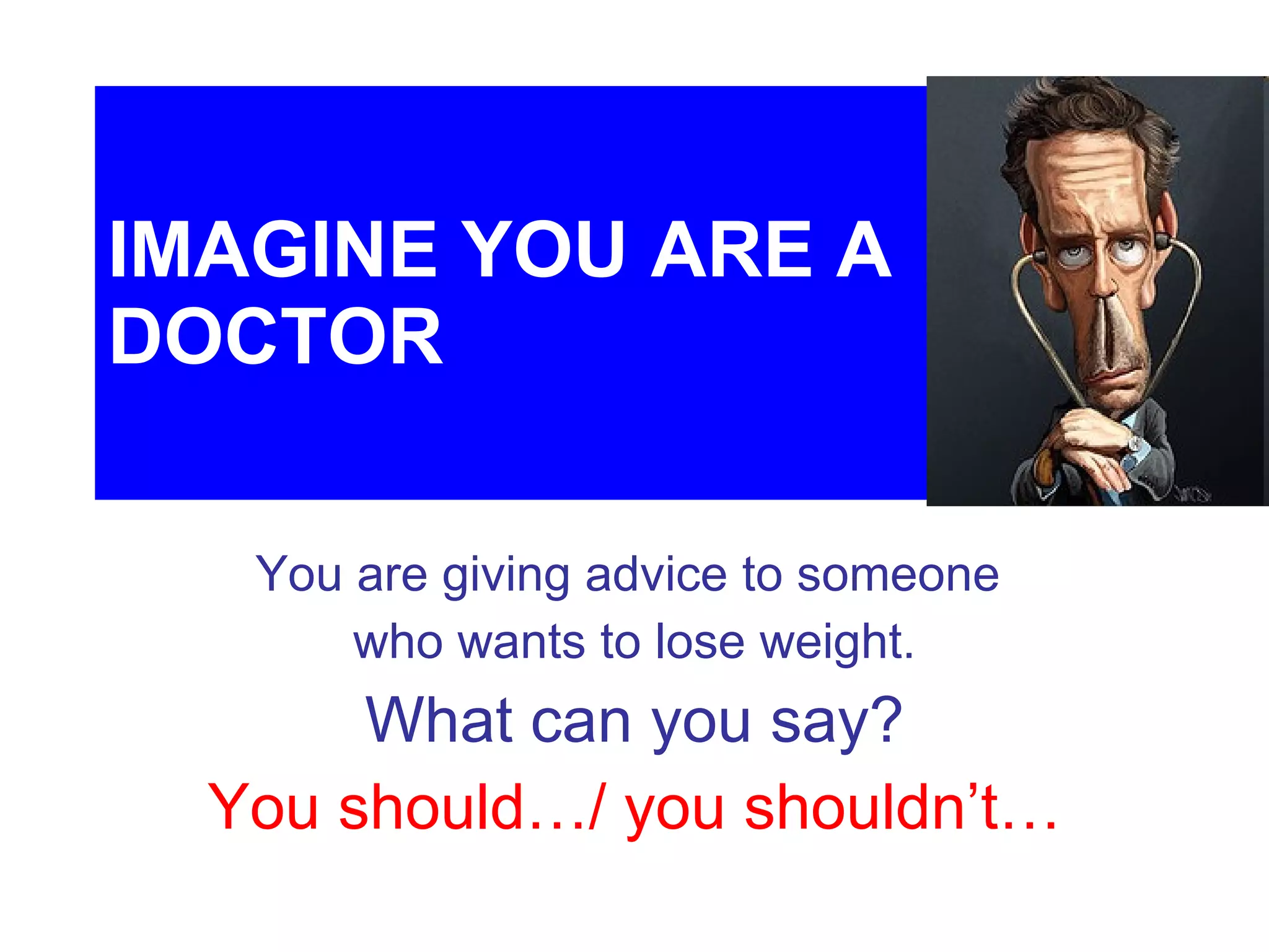 The document is a script for a pretend doctor advising someone who wants to lose weight. The doctor provides dos and don'ts for diet and exercise. They tell the patient to avoid fatty, greasy, or sweet foods like hamburgers, chips, and soda. Instead, the doctor recommends exercising, eating fruits and vegetables, drinking water, and avoiding too many cakes, chips, hamburgers, alcohol, or bread. They also suggest eating tomatoes, avoiding too much coke or ketchup, and engaging in physical activities like basketball, biking, and swimming without overdoing it. In the end, the doctor praises the patient for losing weight and tells them to rest.