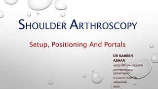The document outlines the setup, positioning, and portal techniques for shoulder arthroscopy, highlighting its historical developments and various therapeutic indications. It discusses the advantages and disadvantages of different positioning methods and portals used during surgery, as well as potential complications associated with each approach. Additionally, it emphasizes the importance of documentation and visualization techniques for pre and post-operative assessment.