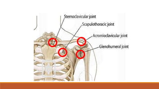 The document provides a comprehensive overview of the shoulder complex, detailing its anatomical components including the shoulder girdle, joints, and ligaments that contribute to its function and stability. It also discusses the motions available at the shoulder, the significance of the rotator cuff, and various assessment techniques to evaluate shoulder conditions, particularly in relation to injuries and age-related changes. The text emphasizes the importance of understanding the dynamic interactions of the muscles and ligaments for maintaining shoulder health and function.