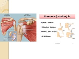 The presentation discusses shoulder dislocation, focusing on the anatomy of the shoulder joint and the three types of shoulder dislocations: anterior, posterior, and inferior. It outlines the causes, clinical features, management strategies, and complications associated with each type. Emphasis is placed on the importance of timely reduction to prevent complications such as avascular necrosis and the management of recurrent instability.